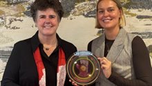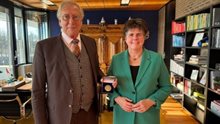 Voormalig zwemster door commissaris van de Koning Ina Adema onderscheiden om uitzonderlijke sportprestatie en betekenis.