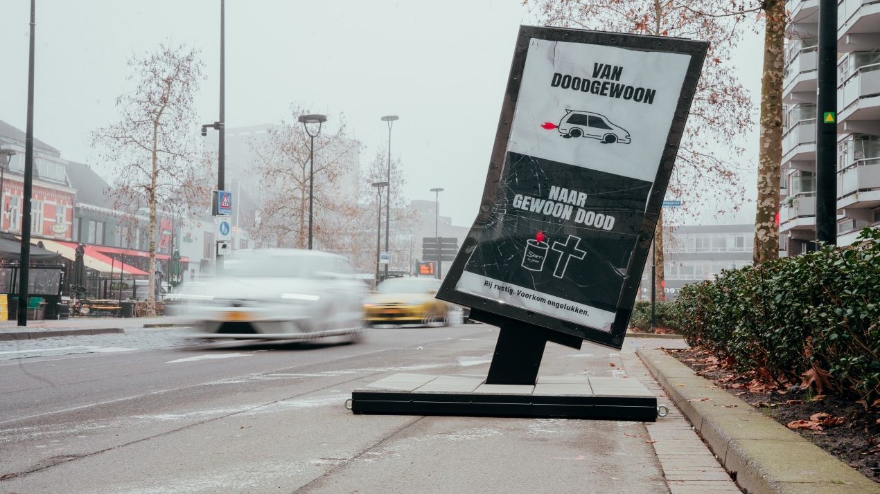 Een kromgebogen frame, versplinterd glas en een confronterende boodschap. Passanten kijken vandaag vreemd op bij het zien van een gehavende reclamezuil aan de Tilburgse Paleisring en Eindhovense Vonderweg. Het blijkt geen vandalisme, maar de start van een provinciale campagne tegen het hoge aantal verkeersdoden in de provincie.