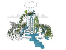 De resultaten van dat onderzoek werden gepresenteerd in de ambassade tijdens DDW op het Ketelhuisplein met een grote expositie waar de inzichten op allerlei manieren tot leven zijn gebracht. Het middelpunt ervan is een maquette installatie die een ode brengt aan regeneratief bouwen. Zie deze schets: