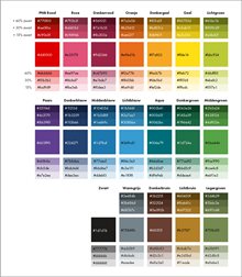 Iedere basiskleur heeft ook een aantal lichtere tinten (60% / 30% / 15%) en donkere tinten (basiskleur + 60% / 30% / 15% zwart):