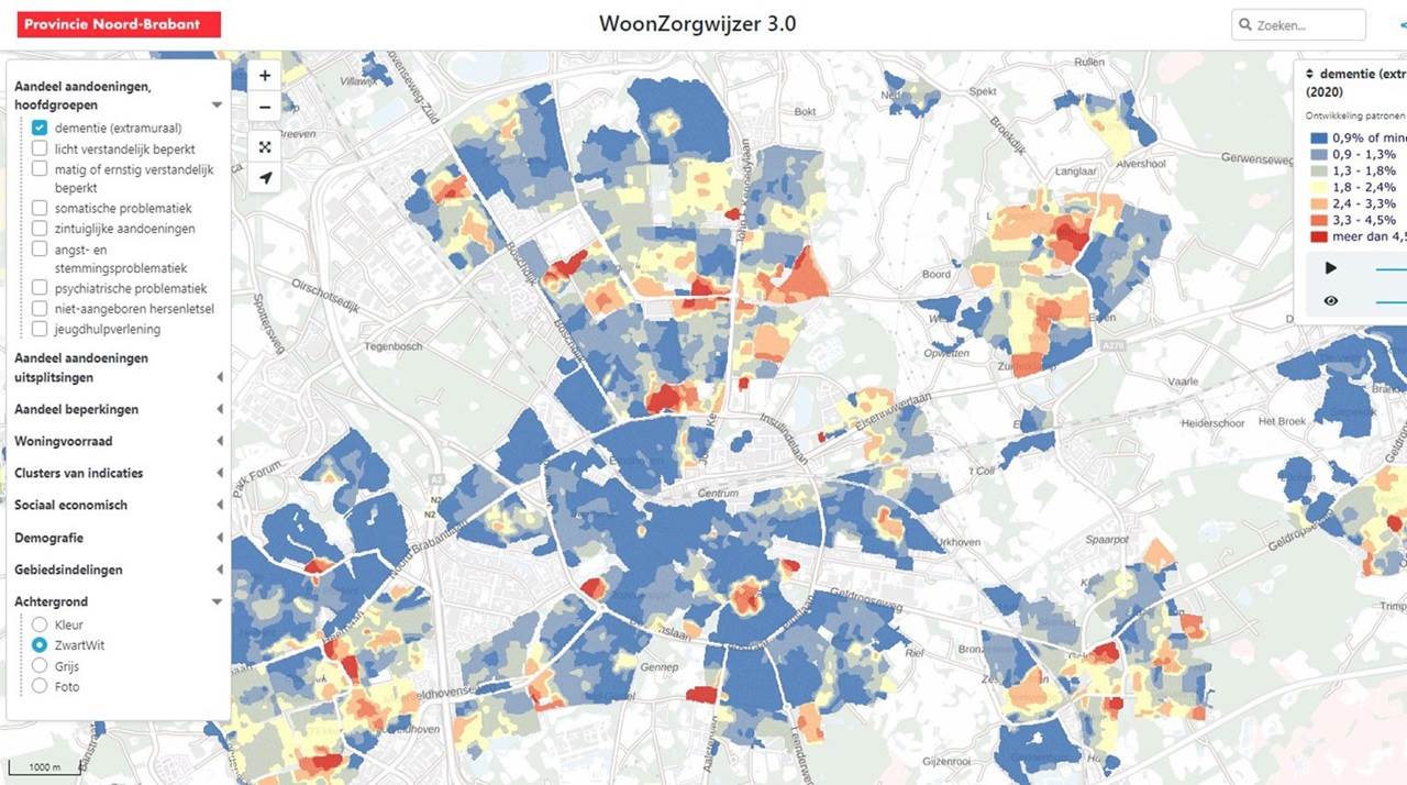 De WoonZorgwijzer biedt inzicht in zorgdoelgroepen (denk aan dementerenden en met mensen met psychiatrische problemen) en het aantal mensen met beperkingen op een bepaald levensdomein (denk aan mobiliteit, een zinvolle daginvulling en administratie en financiën). Deze belangrijke inzichten gaan nog meer spreken als indien ze worden gecombineerd met informatie op andere terreinen, zoals het zorggebruik en het aanbod op het vlak van wonen en voorzieningen. Voor de provincie Noord-Brabant is dit aanleiding geweest het instrument uit te breiden met enkele aanvullende kaarten, omtrent: