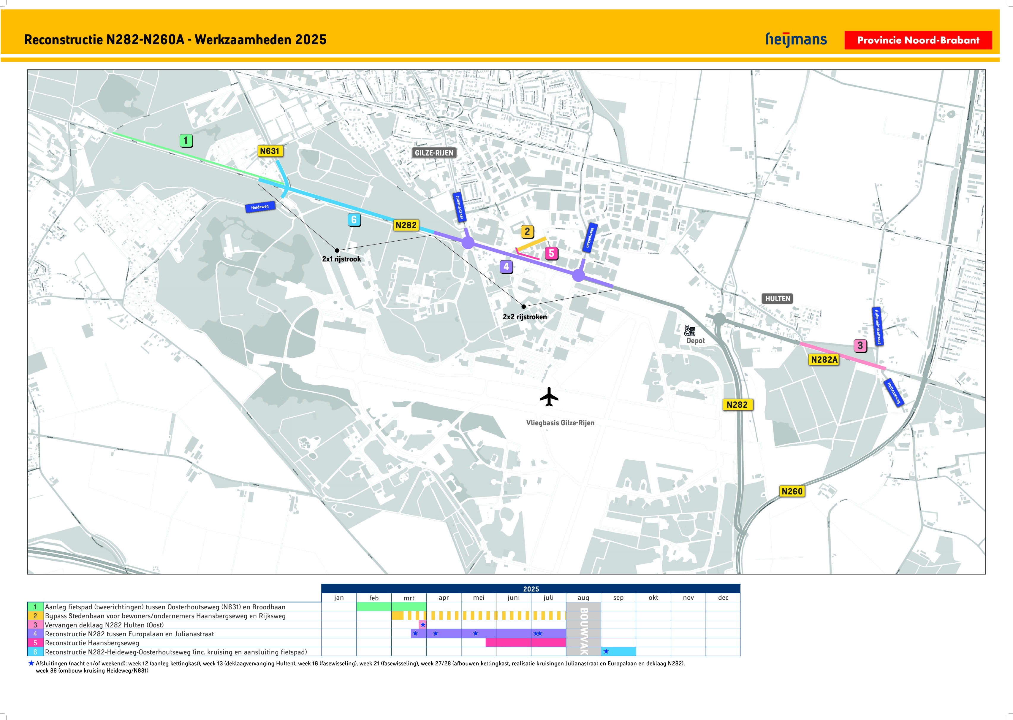 De provincie Noord-Brabant heeft samen met de gemeente Gilze en Rijen gewerkt aan de N282 (Rijksweg) en de N260A (Burgemeester Ballingsweg). De weg is gereconstrueerd en we hebben maatregelen genomen om de verkeersoverlast te beperken. Ook is de doorstroming van het verkeer en de veiligheid op en langs de N282 verbeterd. In het najaar van 2025 zijn de werkzaamheden afgerond.