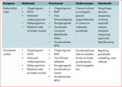 Op grond van de Europese en nationale juridische en beleidsmatige kaders heeft de provincie haar water- en bodembeleid vastgelegd in de Brabantse omgevingsvisie, het regionale Water en Bodem Programma (RWP), de Interim Omgevingsverordening (IOV), na 1 januari 2024 de Omgevingsverordening (OV), een Visie Klimaatadaptatie, een Droogte-agenda (Deze is vastgesteld door het Breed Bestuurlijk Grondwateroverleg (BBG). Daarin zitten provincie, waterschappen, natuurorganisaties, Brabant Water, ZLTO en industriële grondwateronttrekkers), een Grondwaterconvenant en een Beleidskader Milieu. Verder is er voor het landelijk gebied een Houtskoolschets ontwikkeld, als voorbereiding op het Brabants Programma Landelijk Gebied (BPLG). Hieronder staat schematisch hoe de doorwerking van de verschillende regelingen en beleidsstukken op Europees, nationaal en provinciaal niveau plaatsvindt op het gebied van water en bodem sturend. Deze doorwerking is een ontwikkelproces en in die zin dynamisch. In de laatste kolom zijn voorbeelden opgenomen.