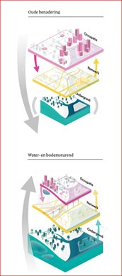 In de afgelopen jaren is de ligging van netwerken en occupatie voornamelijk tot stand gekomen op Afbeelding 5. basis van economische en technische logica, ondergrond speelde hierbij steeds minder een rol. Bij water en bodem sturend speelt die ondergrond juíst een hoofdrol. Het is een sturend middel voor de netwerken en occupatie. Bron: p.15 uit de Praktijkgids: Water en bodem sturend, hoe dan? (College van Rijksadviseurs)